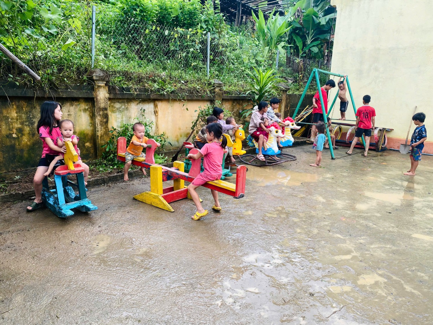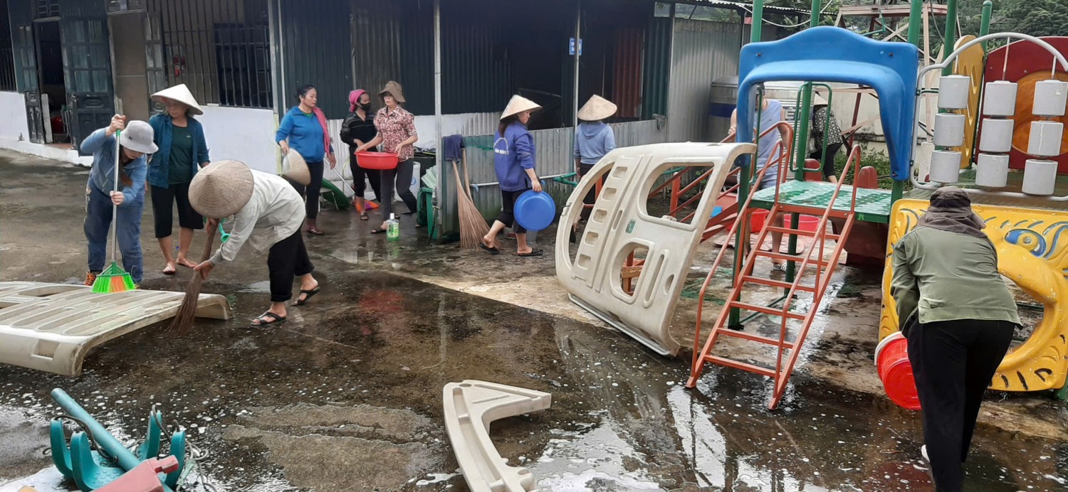 Mường Tùng – những ngày đầu tháng 8, mưa rừng vẫn nặng hạt, con suối trước bản nước chảy xiết như muốn cuốn trôi mọi bước chân. Ấy vậy mà, từ sáng sớm, những dáng người nhỏ bé trong áo mưa mỏng vẫn kiên trì lội qua làn nước lạnh buốt, bùn đất ngập quá đầu gối. Họ – chính là những cô giáo mầm non của Trường Mầm non Mường Tùng, đang trên đường đến các điểm trường để khởi động chiến dịch “Trường sạch, lớp xanh” chào năm học mới.