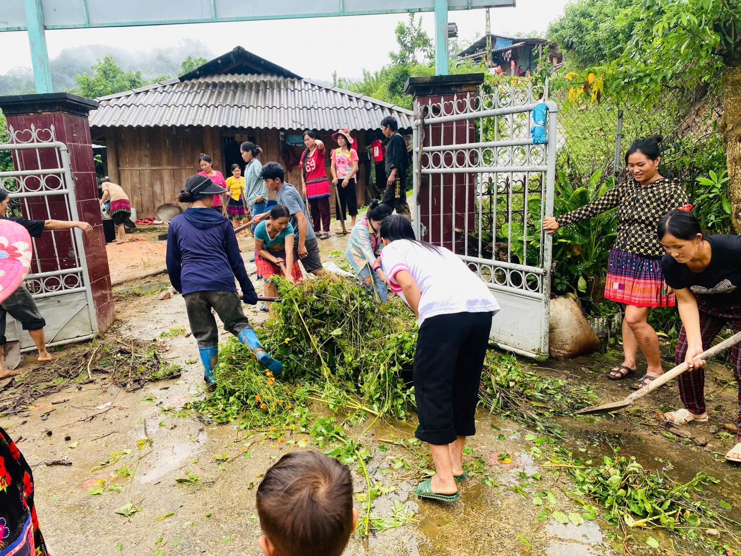 Hình ảnh: Phụ huynh điểm trường Huổi Chá 2 tham gia lao động dọn dẹp khuôn viên điểm trường